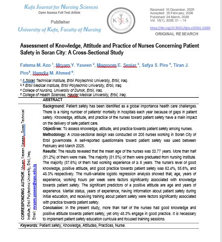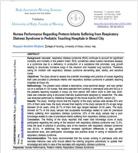 Kufa Journal for Nursing Sciences (KJNS) is a scholarly, peer-reviewed, and open access journal, which aims at cultivating the dissemination of scientific knowledge through publishing original research and review papers related to nursing and healthcare sciences. The KJNS is published by Faculty of Nursing , University of Kufa.